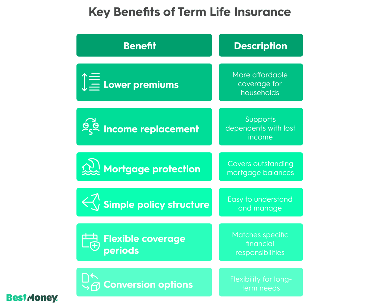 Conversion options: Some policies allow conversion to permanent life insurance later, providing flexibility if long-term needs change.