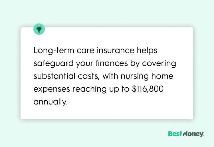 1. Financial Security: Traditional health insurance and Medicare typically don't cover long-term care, leaving you and your family to shoulder these expenses. Nursing home costs range from $285 to $320 per day, totaling $104,025 to $116,800 annually. These steep prices can rapidly deplete your savings. Long-term care insurance helps safeguard your finances by covering these substantial costs.