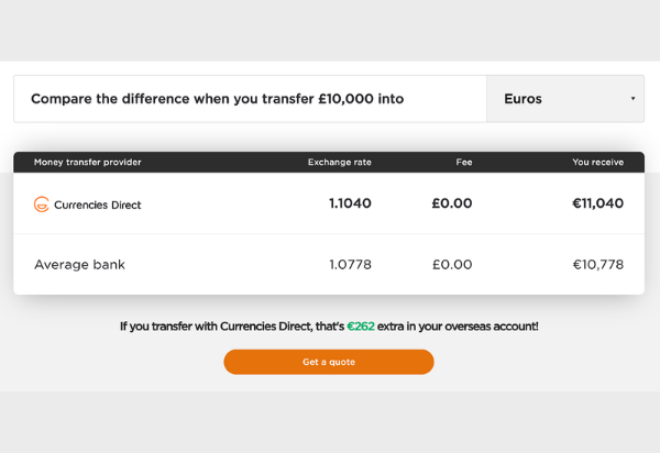 How much Currencies Direct charges through this difference depends on what countries you are transferring between and how much money you’re sending. For sending money from the US to the UK, the exchange rate difference is typically between 0.25% and 0.5%. However, if you’re sending money to Africa, the rate difference that Currencies Direct is charging can be as high as 1.5%.