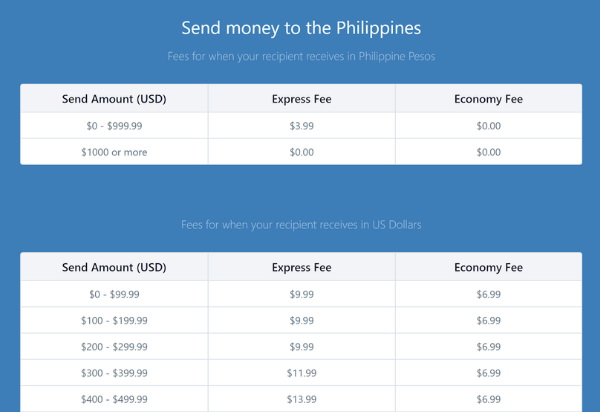 As an example of how rates are determined, let’s look at sending money to the Philippines. In this case, sending money by bank transfer (which takes three to five days) is fee-free if the recipient receives Phillipine pesos rather than US dollars. If you pay by debit card for an Express transfer, it costs $3.99 to send less than $1,000 or the transfer is fee-free if you send more than $1,000.