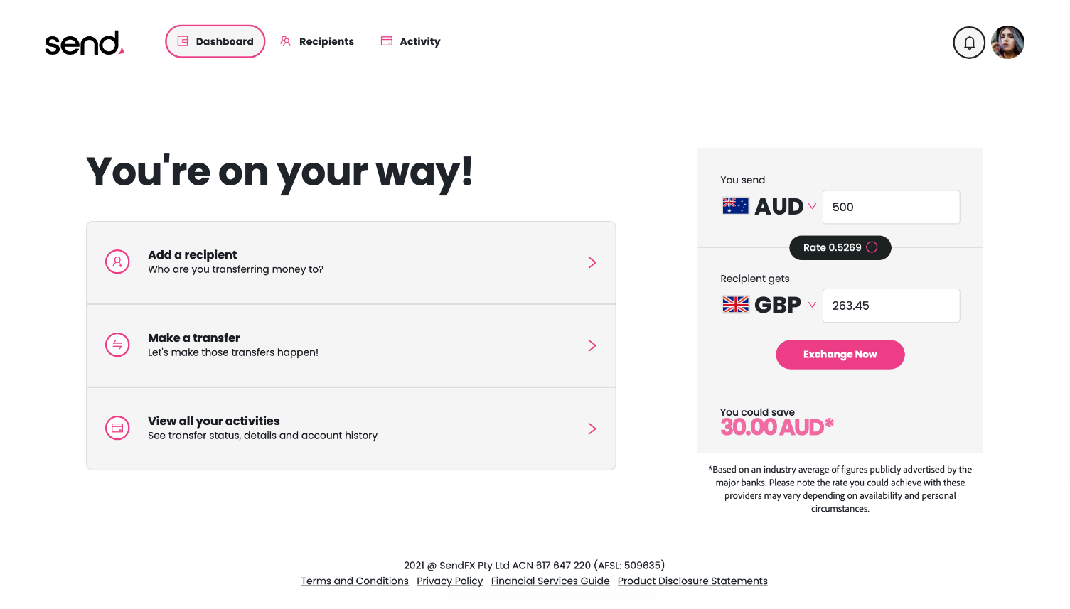 Send complies with the Australian Securities and Investments Commission (ASIC) regulations. It has an Australian Financial Services License (AFSL) and is a member of the Australian Financial Complaints Authority (AFCA). Send is also registered with the Australian Transaction Reports and Analysis Centre (ATRAC).