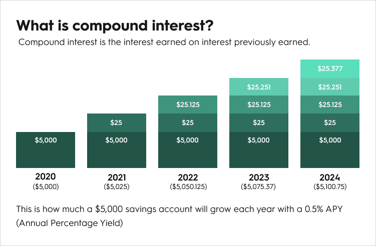 This might not seem like a big deal, but keep on earning compound interest over months and years, and it starts to make a huge difference. You’d earn $50.25 interest in year one, year two $50.76, and by year five - $52.30. The more you deposit in your savings account and the higher the interest rate, the more interest you earn.