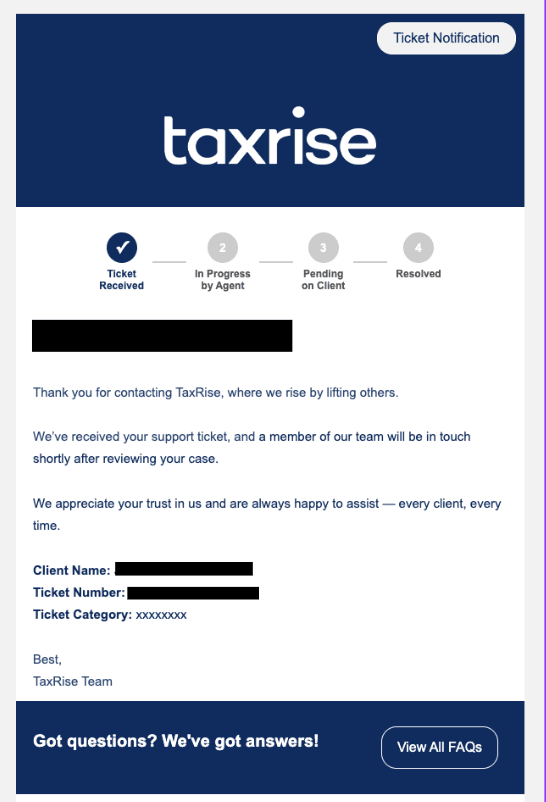 Existing clients can contact TaxRise by phone, via email at clients@taxrise.com, or through the client portal. The TaxRise phone number for existing clients is (833) 419-7473. The company doesn’t offer live chat support, which can be frustrating if you prefer instant, message-based assistance.