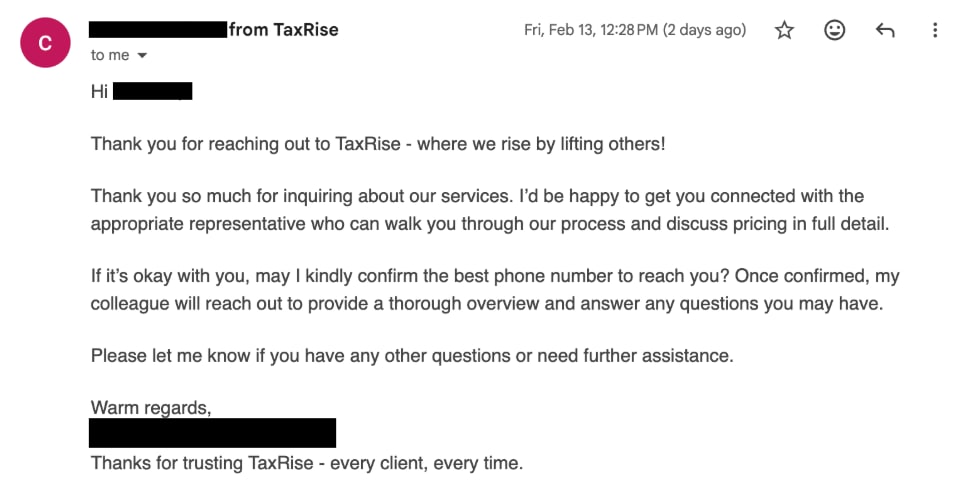 TaxRise responded via email a few hours into the next business day, offering to connect us with a representative by phone who could provide pricing details.